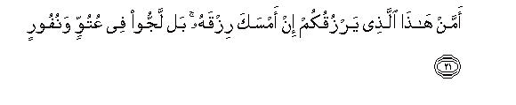 21. Amman hatha allathee yarzuqukum in amsaka rizqahu bal lajjoo fee AAutuwwin wanufoorin