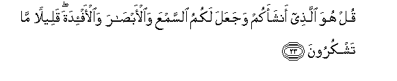 23. Qul huwa allathee anshaakum wajaAAala lakumu alssamAAa waal-absara waal-af-idata qaleelan ma tashkuroona
