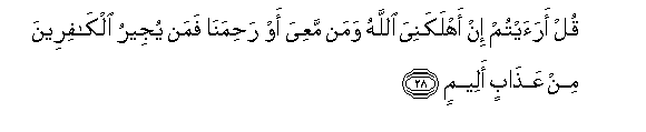 28. Qul araaytum in ahlakaniya Allahu waman maAAiya aw rahimana faman yujeeru alkafireena min AAathabin aleemin