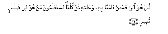 29. Qul huwa alrrahmanu amanna bihi waAAalayhi tawakkalna fasataAAlamoona man huwa fee dalalin mubeenin