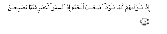 17. Inna balawnahum kama balawna as-haba aljannati ith aqsamoo layasrimunnaha musbiheena