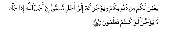 4. Yaghfir lakum min thunoobikum wayu-akhkhirkum ila ajalin musamman inna ajala Allahi itha jaa la yu-akhkharu law kuntum taAAlamoona