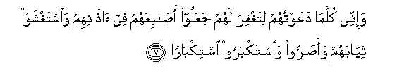 7. Wa-innee kullama daAAawtuhum litaghfira lahum jaAAaloo asabiAAahum fee athanihim waistaghshaw thiyabahum waasarroo waistakbaroo istikbaran