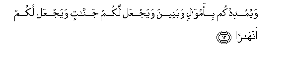 12. Wayumdidkum bi-amwalin wabaneena wayajAAal lakum jannatin wayajAAal lakum anharan