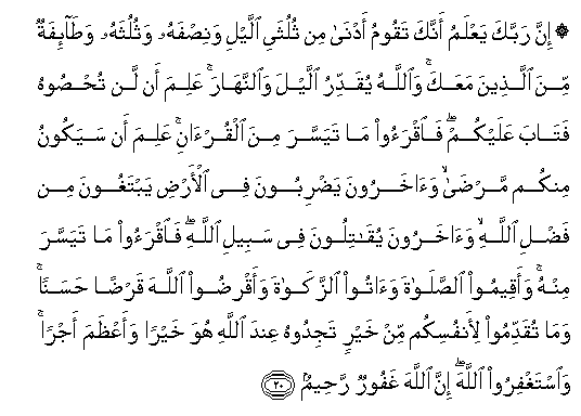20. Inna rabbaka yaAAlamu annaka taqoomu adna min thuluthayi allayli wanisfahu wathuluthahu wata-ifatun mina allatheena maAAaka waAllahu yuqaddiru allayla waalnnahara AAalima an lan tuhsoohu fataba AAalaykum faiqraoo ma tayassara mina alqur-ani AAalima an sayakoonu minkum marda waakharoona yadriboona fee al-ardi yabtaghoona min fadli Allahi waakharoona yuqatiloona fee sabeeli Allahi faiqraoo ma tayassara minhu waaqeemoo alssalata waatoo alzzakata waaqridoo Allaha qardan hasanan wama tuqaddimoo li-anfusikum min khayrin tajidoohu AAinda Allahi huwa khayran waaAAthama ajran waistaghfiroo Allaha inna Allaha ghafoorun raheemun