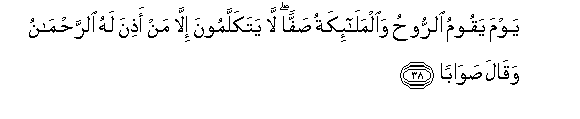 38. The Day that the Spirit and the angels will stand forth in ranks, none shall speak except any who is permitted by ((Allah)) Most Gracious, and He will say what is right.