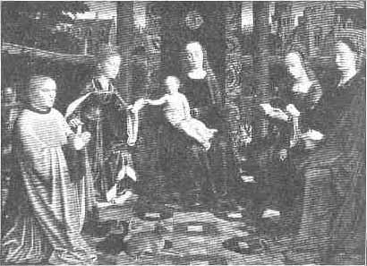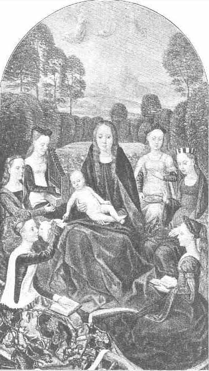 | By Hans Memling, d. 1494. (Louvre.) St. Barbara is represented with a book, and in the background are Cecilia, Agnes and other saints. |