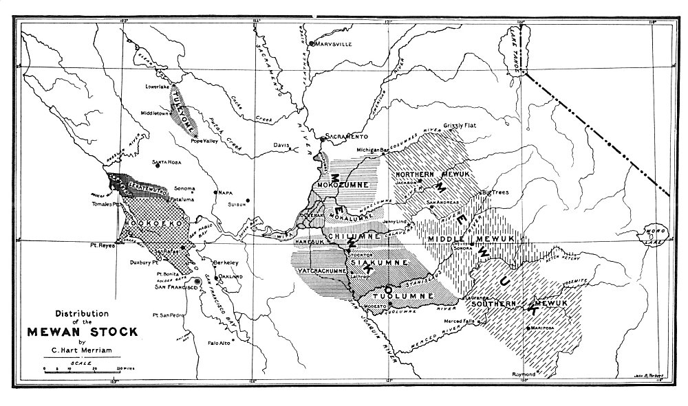 The territory of the Mewan tribes comprised the lower slopes and foothills of the Sierra Nevada between the Cosumnes River on the north and Fresno Creek on the south, with the adjacent plain from the foothills to Suisun Bay, and also two smaller disconnected areas north of San Francisco Bay--one in the interior, reaching from Pope Valley to the south end of Clear Lake, the other on the coast, from Golden Gate northerly nearly to the mouth of Russian River. (See accompanying map.)