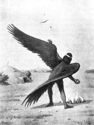 "All right," said Ke'-lok, and he immediately sprang up and darted up into the sky, for he was great and powerful and could do all things. As he went up he made a loud noise. Then he came down in a zig-zag course, and as he came, sang a song.