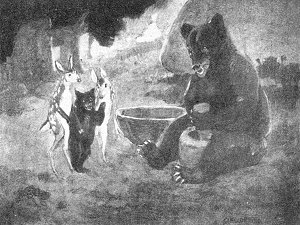 So they took the baby bear out in the woods to play, and went to the side of a hill and dug a hole. They said to the cub, "We will go in first and you close the hole and smoke us, and when we call, you let us out. Then you go in and we will smoke you."