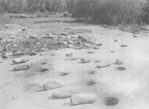 A long time ago Oo-soo'-ma-te the Grizzly Bear and Hoi-yah'-ko the FIRST PEOPLE, made the Chaw'-se or mortar holes in the big flat-topped rocks. Then Nek'-na-kā'-tah the rock maiden came and helped make the Kah-wah'-che or stone pestles for the people to pound acorns with.