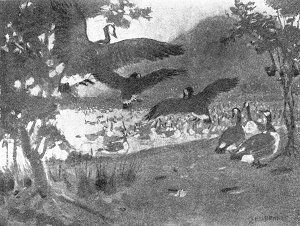 just then Kah'-kah-te the Crow came out of his house and in the darkness saw a little speck of light moving back and forth among the trees. It was the fire bug going home with the little Shrew brothers. Kah'-kah-te when he saw it cried, "Somebody has stolen my fire," and set out in pursuit.