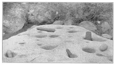These acorns are quite bitter, and are not eaten in their natural condition, as most fruit and nuts are eaten, but have to be quite elaborately prepared and cooked to make them palatable. First, the hull is cracked and removed, and the kernel pounded or ground into a fine meal. In the Yosemite Valley and at other Indian camps in the mountains, this is done by grinding with their stone pestles or metats (may-tat's) in the ho'yas or mortars, worn by long usage in large flat-top granite rocks, one of which is near every Indian camp. Lower down in the foothills, where there are no suitable large rocks for these permanent mortars, the Indians used single portable stone mortars for this purpose.
