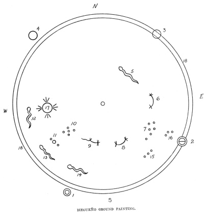 Ground Painting, made by Manuel Lachuso, an old man of Santa Ysabel. He had forgotten the precise location of the milky way, sun, new moon, and old moon, so they are omitted. He made no mention of toloache mortars.