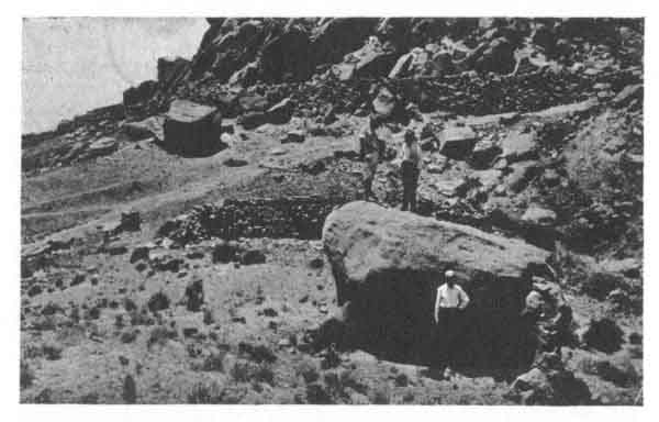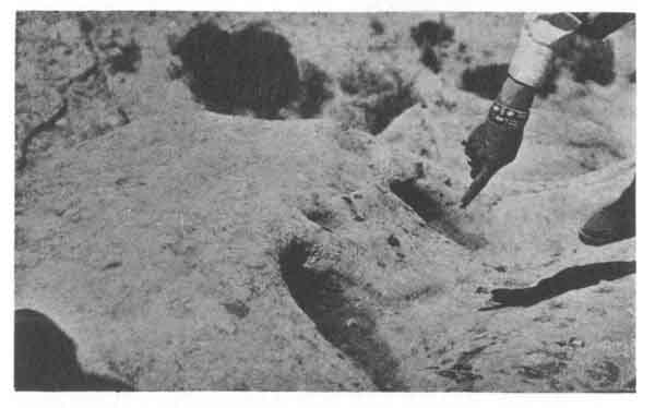 About a hundred yards south of this spring stands a large boulder (Fig. 1). On the top of this boulder can be observed three holes in a row, each hole being about a foot in diameter and between a foot and two feet deep (Fig. 2). Hopi tradition associates these holes with a Hopi ceremony now extinct call the Ladder Dance.
