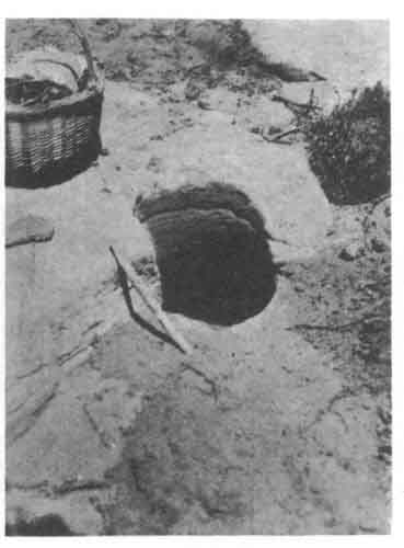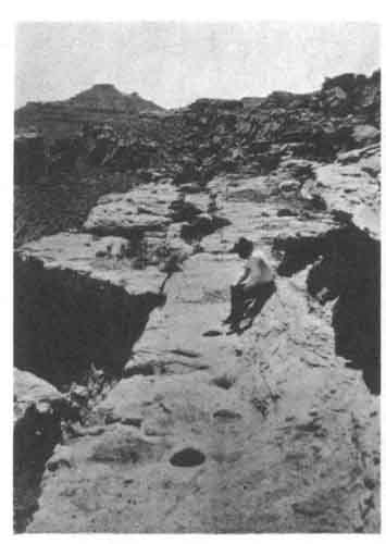 About 100 yards east of Pivahonkiapi can be observed eight circular holes, about eight inches in diameter, cut in the rock at the cliff edge. About one of these holes the rock has cracked. The Hopi believe that these holes belong to the "ladder dance."--Ed.