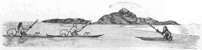 Next day he went out in his kayak, and when the sun was in the west, his wife went often and often to look out. And once when she went thus, she saw that he had came, and from that moment she was no longer sleepy.
