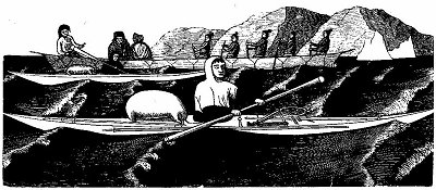 A kayaker in a half-jacket of skin, and a white cotton jacket (present fashion). Travellers in umiak.