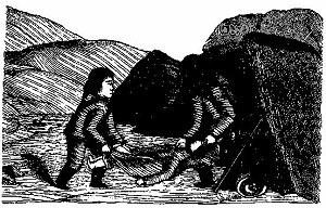 beginning of their flight they exercised themselves in boxing and in lifting large stones to strengthen their limbs; and they grew on, and had become strong and vigorous men ere they again met with other people. After a great lapse of time they one day noticed a man standing on the ice beside a huge piece of wood, which he p. 135 had made use of in hunting the small seals. When they approached and told him what had befallen them, he said he would like to adopt them as his sons, and they followed him to a house where he and his wife lived all by themselves. Their foster-parents encouraged them never to forget their enemies, but always to be exercising themselves in order to strengthen their limbs. One night the brothers came home laden with ptarmigan and foxes, which they had caught without any weapons at all, only by throwing large stones at them, which made the old people rejoice very much, commending their dexterity and perseverance. To increase their strength still farther, they lifted very large stones with their hands only. They also practised boxing and wrestling; and no matter how hard the one might be pressing on the other, they made a point of never falling, but rolling together along the ground. At last, with constant practice, they had grown so dexterous that they could even kill a bear without any weapon. At first they gave him a blow, and when he turned upon them they took no more notice of him than if he had been a hare, but merely took hold of him by the legs and smashed him to pieces. When these results had been gained, they began to think of seeking out other people. Where? That was a matter of indifference. They now took a northerly direction, and wandered on a long way without falling in with any human being. At length they came to a great inlet of the sea, where a number of kayakers were out seal-hunting, but only one of them seemed to be provided with weapons. This one was their chief, or the "strong man" among them. He always wanted to harpoon the animals himself which had been hunted by the others—these had only to chase and frighten them; and if anybody dared to wound them, he was sure to be punished by the chief in person; but as soon as the "strong man" had pierced them with his arrow, the others all helped to kill them. Kunuk and p. 136 his brother were too modest to go down at once, and awaited the approach of evening. Meanwhile they witnessed the cutting up of a walrus, and saw it being divided—each person getting a huge piece for himself, excepting an old man, who lived in the poorest tent, who got nothing but the entrails, which his two daughters helped him to carry home from the beach. The brothers agreed that they would go to the old man when it had grown dark, because they had taken pity on him on account of his patience. Having arrived at the tent, Kunuk had to enter by himself, his brother being too bashful to follow him. The old man now inquired of him, "Art thou alone?" "No, my little brother is standing outside; he is ashamed to enter." On hearing this, the old man cried, "Come in, thou who art standing outside;" and when he entered, he was astonished to see his strong limbs, he being even bigger than his brother. When the meal was over the old man said he would like to have them for his sons-in-law, and that they might go and take his daughters for their wives. Kunuk chose the youngest of them, and his brother got the eldest; and thus they got married. It is said that while going down to the place, they first went to have a look at the boats, and examined them closely; and that on seeing the weapons of the "strong man," they had taken his javelin (or arrow to be flung only by hand) away, with the intention of hiding it, so that the others might get something to look for. They brought it away to a spring, and a little way off they stuck it down into the earth, but pulled it out again, trying another place, where the turf was dry and hard. There Kunuk fixed it so deep in the ground that only so much of it as could be seized with two fingers was to be seen. While they were lying down inside the tent, they heard some one come running along, and partly lift the curtain, but instantly drop it and go off again. It was an old gossip, and mother to the "strong man," who had p. 137 been doing this; and a moment later a multitude of people gathered round the entrance of the tent, to get a peep at the strangers. In the morning they heard the chief crying out, "This is a fine day for a walrus-hunt;" upon which he was silent a while, and then said, "My javelin has been taken away," which was repeated again and again by many others. When Kunuk emerged from the tent he saw several of the men coming out rubbing their eyes, and saying, "I must surely have slept too long!" However, it was only out of reverence for the "strong man" that they spoke thus. While they were shouting, they heard the old gossip, who had been away to fetch water, exclaim, "Look, yonder is the javelin!" and at the same time she pointed to the rock leading to the spring. All of them now rushed to the spot, in order to pull it out of the earth, but nobody succeeded in doing it. The brothers were now called, and were asked to draw it out. They had all been pulling and biting it with their teeth to get it loose, so that the end had been quite wasted. But Kunuk just took it between his two fingers, and disengaged it as if it were a very small matter. On their way down to the shore their father-in-law addressed them, and said, "Down there, underneath the great boat, are the two kayaks of my dead son. They are perfectly fitted up, and furnished with weapons, and are quite easy to get at." These things he now wanted to make over to his sons-in-law, and he told them that the "strong man" had murdered his son because he envied him his still greater strength; for this reason he was now the enemy of his daughters. Hitherto, however, they had not been able to get their revenge. After a short interval t