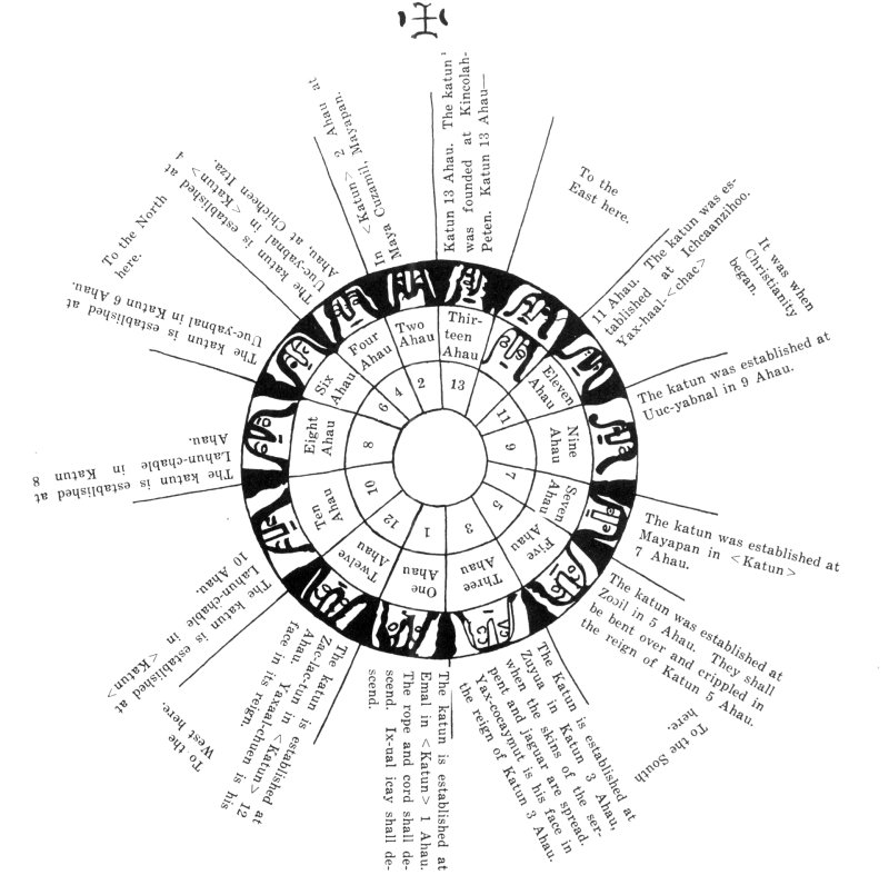 It should be noted that on this wheel, although the succession of katuns is as usual to the right, the sequence of the directions, or world-quarters, East, North, West and South, is to the left.
