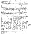 Of their letters we give here an a, b, c, their cumbersomeness not permitting more, because for all the aspirations of the letters they use one character, and then for uniting the parts another, going on in this way ad infinitum, as in the following example. Le means a lasso, and to hunt with one; to write it with their letters, they wrote them with three, at the aspiration of the l the vowel e, put before it; in this they are not at fault, although they use the e if they wish to do so for definiteness. Example: e l e lé; afterwards they put the syllable joined: