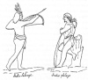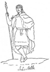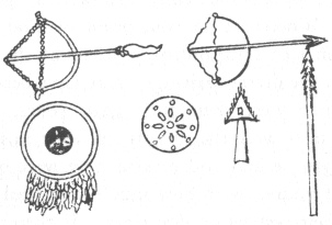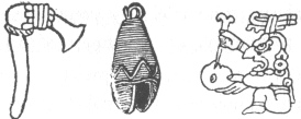94:* p. 93 In seeking to illustrate the objects of use referred to by Landa we are helped by the known extent of their trading relations, from Honduras as far as the Mizteca region. Cortés needing to cast brass cannon sought and found the needed source of tin, and that this hardened copper was a part of the Tabasco trade we know. Landa also speaks in his last chapter of fire-hardened spears, a weapon hard to find still surviving as a specimen. The same with their ancient bows and arrows. Even the marginal figure here referred to in the text has been left out in the transcribed copy of Landa's manuscript; all however without leaving us wholly without pictured reproductions. Of the illustrations on these pages the collection of implements is taken from the manuscript of Fuentes y Guzmin's history of Guatemala, as also are the interesting human figures representing native bowmen, and also an "Indio noble" holding what is clearly a spear of hardened wood. Of the three small figures in the margin above we have a copper axe from an original Mexican codex, a copper bell from the p. 94cenote at Chichén Itzá, and an illustration of the use of one of the very copper chisels to carve the 'idols,' from the Madrid codex. A chipped flint sacrificial knife, also from the cenote, has been shown previously.