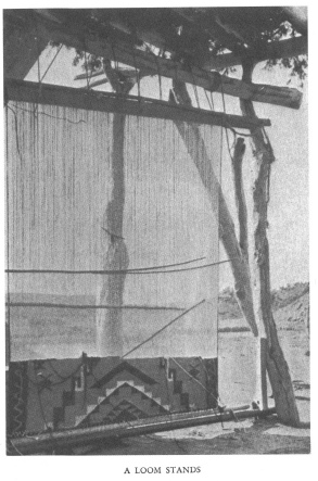 "Spider Woman instructed the Navajo women how to weave on a loom which Spider Man told them how to make. The crosspoles were made of sky and earth cords, the warp sticks of sun rays, the healds of rock crystal and sheet lightning. The batten was a sun halo, white shell made the comb. There were four spindles; one a stick of zigzag lightning with a whorl of cannel coal; one a stick of flash lightning with a whorl of turquoise; a third had a stick of sheet lightning with a whorl of abalone; a rain streamer formed the stick of the fourth, and its whorl was white shell." (Navajo Legend)