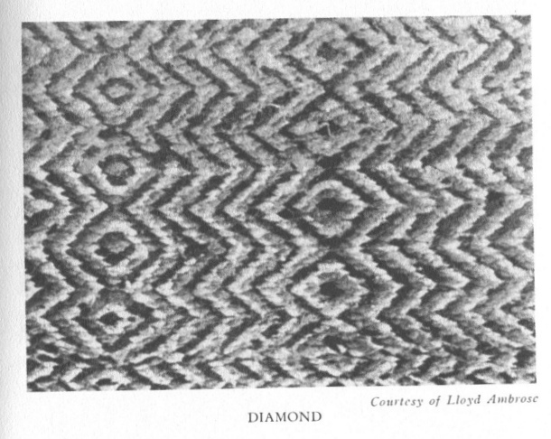 The design resulting from the combination of different sheds and variation of weft color in the most complicated is a diagonal. It may be varied by different shifts almost indefinitely, but it remains the basic design. Another division of the sheds thrown in the proper order for a given distance, then reversed, results in a diamond, large or small depending entirely upon the number of warps in the set-up. It is not difficult from these loom models to grasp the essentials of the shedding quickly. It is necessary in addition to dissect the weft throwing. Since the loom models are loose, it is easy enough to push up the wefts row by row and coördinate them