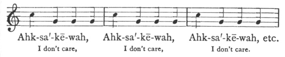 Good words. The people were glad. So they went back, and got ready for the doctoring. First, Old Man ordered a large fire built in the lodge where the dead girl was lying. Two old men were placed at the back of the lodge, facing each other. They had spears, which they held above their heads and were to thrust back and forth at each other in time to the singing. Near the door-way were placed two old women, facing each other. Each one held a puk'-sah-tchis, 1a maul,with which she was to beat time to the singing. The other seats in the lodge were taken by people who were to sing. Now Old Man hung a big roll of belly fat close over the fire, so that the hot grease began to drip, and everything was ready, and the singing began. This was Old Man's song: