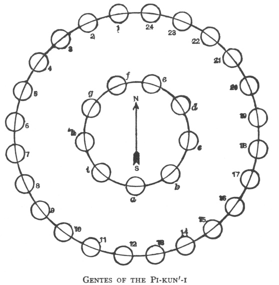 disappearance of the buffalo, the camp was always arranged in the form of a circle, the lodges standing at intervals around the circumference, and in the wide inner space there was another circle of lodges occupied by the chief of certain bands of the I-kun-uh´-kah-tsi. When all the gentes of the tribe were present, each had its special position in the circle, and always occupied it. The lodge of the chief of the gens stood just within the circle, and about it his people camped. The order indicated in the accompanying diagram represents the Piegan camp as it used to stand thirty-five or forty years ago. A number of the gentes are now extinct, and it is not altogether certain just what the position of those should be; for while all the older men agree on the position to be assigned to certain of the gentes, there are others about which there are differences of opinion or much uncertainty. It is stated that the gentes known as Seldom Lonesome, Dried Meat, and No Parfleche belong to that section of the tribe known as North Piegans, which, at the time of the first treaty, separated from the Pi-kun'-i, and elected to live under British rule.
