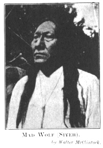ONE afternoon in midsummer, while riding with Siksikakoan across the plains, we met Mad Wolf near Willow Creek. He was alone and signified his desire to speak with me. He was standing with his blanket drawn closely around him. His long hair tinged with gray fell loosely over his shoulders. From his neck hung a medicine whistle made from the wing-bone of an eagle. In his back hair, a single eagle feather stood erect. When I had dismounted, he warmly shook my hand. For a moment, he gazed into my face with eyes as penetrating as those of an eagle. Then, with head erect, he addressed me in a strong and earnest voice.