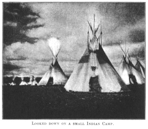 Upon the day following my meeting with Mad Wolf the sky was overcast. Riding in a northerly direction, I arrived at the ridge pointed out by the chief. I paused on its crest, and looked down upon a small Indian camp. The freshening wind had begun to drive low clouds over the plains, while occasionally a furious gust shook the lodges, firmly anchored by ropes thrown around their tops. The only living thing to be seen
