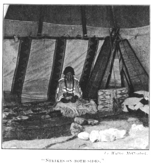 twenty-five feet in diameter. Mad Wolf was seated at the back,—the position of honour. His relatives and friends were on either side, the men to his left, and the women to his right. He greeted me with a warm handshake and said, "Ke-a-e-es-tsa-kos-ach-kit-satope" (spread the robe out for him to sit down). He wore beaded buckskin leggings and moccasins and from his neck was suspended a medicine whistle. He had a noble countenance, and a large and shapely head, the upper part of his body was bare, his shoulders broad and well formed, and his arms strongly developed, he was in every way a magnificent specimen of Indian manhood. From his piercing glance and the firm expression of his mouth, I knew he was accustomed to command. He had a natural dignity of manner, while conducting the ceremonial, that fascinated me, and I found myself intently watching his every movement.