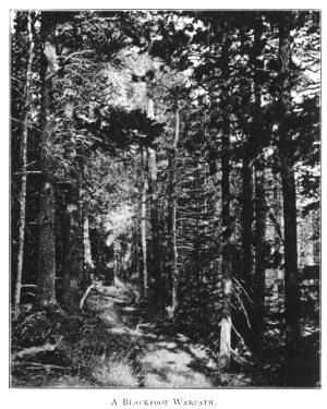 Passing through the foot hills, and riding along the Cutbank River, we entered the mountains. Siksikakoan followed the old Blackfoot war-trail, used by them in the early days, when they crossed the Rockies on war expeditions against the Pend d’Oreille, Kutenai, and Flathead tribes. We passed through small parks of luxuriant bunch grass brilliant with wild flowers, and along the shores of lakes hidden away among the