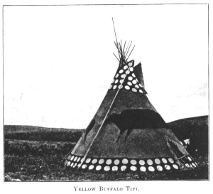 seen in our big camps. It now belongs to Mu-koi-sapo. You will recognise it by two buffaloes painted yellow around the middle. A yellow buffalo calf skin is used for a door flap. The top is painted black to represent a night sky, with many small discs for stars, and around the bottom is a black band with a single row of dusty stars.
