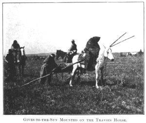 GIVES-TO-THE-SUN MOUNTED ON THE TRAVOIS HORSE.