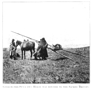 GIVES-TO-THE-SUN'S OWN HORSE WAS HITCHED TO THE SACRED TRAVOIS.