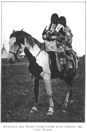 a granddaughter of the head chief. They were both astride the same horse and greatly interested me, because of their vigorous conversation in the sign language. Anatapsa, gaily dressed, sat in front, her long black hair flying in the wind. Her blanket of brilliant scarlet fell loosely from her shoulders,