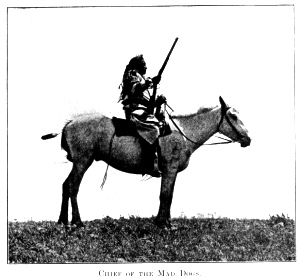 All eyes were now fixed upon Mad Wolf's lodge, waiting for the signal to move. When it was taken down, the entire camp became a scene of confusion. Mad Wolf mounted his horse, singing a chant. He rode with O-mis-tai-pokah to a ridge near by and was closely followed by Natokoma and Gives-to-the-Sun with the