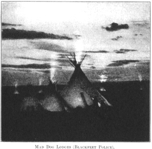 [paragraph continues] White Man. During the day, the Indians continued to come from all directions, until they numbered about two thousand. There were representatives from many leading tribes of the north-west, the Nez Perce, Sarcees, North Blackfeet, Bloods, Crees, Assinniboines, Gros Ventres, Flatheads, Bannocks, Kutenai, Pend d’Oreilles, Mandans and Sioux. The camp was formed in an enormous circle, with the site for the sacred Sun-lodge in the centre. Many tipis of the leading chiefs were strikingly decorated. They were pitched, for the most part, in the inner circle, the most conspicuous part of the encampment, while the small and inferior tipis were relegated to the outskirts of the great circle. The three lodges of the Mad Dog Society (Blackfeet police) were grouped near the centre of the great circle. To them the chiefs looked for the enforcement of their orders and the policing of the encampment. In moving camp, they saw that none lagged behind, and in making camp, that every lodge was in its proper place, and that the great circle was symmetrically formed. I have never seen an equally large gathering of white men where there was as little disturbance. Although I was continually present, I saw no fighting in the great encampment, and it was a rare occurrence to hear even angry words. In their largest lodge, the Mad Dogs kept their weapons and society clothes, and assembled to feast and to dress for their dances, which took place both day and night.