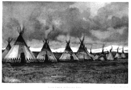 jingled at every step. Then came a number of travois, laden with lodges and supplies in charge of squaws. In the rear were groups of old men, women, children and young girls. Each family had its pack of dogs, all as gaunt and hungry-looking as prairie wolves. To the south lay Willow Creek and the broad plain selected by Mad Wolf for the camp, resembling an enormous