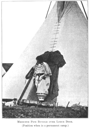 "The Owl is also a prominent figure in the Pipe ceremonial, because he is a bird of the night. When the society are after a new member, they chant Owl songs and pray to the Owl for power to enable them to catch him in a deep sleep. In this way a spell is cast over him and he cannot escape. In order to propitiate the Owl they also, in the ceremonial, make use of the Siksocasim-root, which is his favourite food. The Indian made the Medicine Pipe, just as the Thunder and the Bear had instructed him. It is wrapped with raw hide and decorated with feathers and the winter skins of weasels. He also gathered together many animal and bird skins for the sacred bundle, wrapping them in a large grizzly bear skin. In the spring, when the first Thunder was heard, the Pipe was brought forth and held up. The Blackfeet had never before seen a Medicine Pipe, but they have ever since continued the ceremony."
