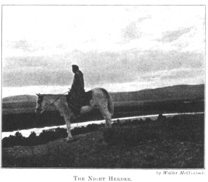 With the dawn, a light breeze came from the Rockies, making a low humming sound in the tightly stretched canvas and causing the lodge ears to flap gently like a loose sail. The quick movement of horses’ hoofs, passing in the direction of the meadow, where the herd of horses was feeding, meant that the day-man was going to the relief of the night-herder. A sudden beating of many drums, accompanied by shouting and singing, came from the clan of Grease Melters. When I opened my door, the morning star had risen above the plains. In the uncertain light, I could distinguish a crowd marching through the camp. People in the surrounding lodges were talking excitedly and I knew something unusual had happened. Then the powerful voice of Elk Horn, the herald and a leader of the Grease Melters was heard, as he rode around the camp circle beating upon a drum. He called upon all members of the clan to build their fires and prepare the morning meal, announcing: