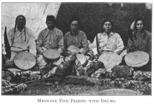 MEDICINE PIPE PRIESTS WITH DRUMS.