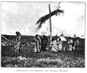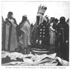took pieces of the consecrated meat and came before the tribe, the priests, and the givers of the Sun-dance. On all sides women were standing and facing the setting sun, each with right hand upraised, holding aloft portions of the sacred food, making vows,