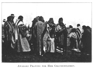 Awasaki, an old woman, the wife of Painted Wing, came forward with the children of Wakes-up-last, 1 her son. When the small line was properly formed, Awasaki, raising her voice, called upon all to hear. The silence and respectful attention of the spectators, the grandmother, and the children by her side, standing before the venerable chiefs and medicine women, made