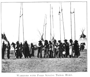 took her position with Natokema beside the forks of the Centre Pole. Four times the lines of warriors advanced and stopped. On the fourth advance, they stood in a large circle around the unfinished Sun-lodge, singing in unison. The solemn and inspiring notes of their great "Hymn to the Pole" floating out over the quiet plain, the light of the evening sun, now sinking behind the Rocky Mountains, falling upon the strong and earnest faces of the chiefs and medicine women and