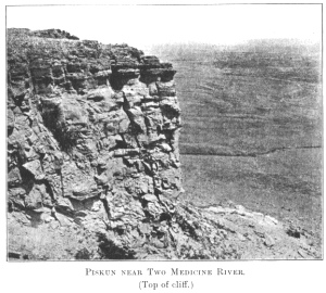piskun we had there. When we ran a herd of buffalo over the cliff they fell into the mud which was so soft it covered their heads. Two Medicine River was named, because we once had a double piskun there. We drove the buffalo over one, or the other, as we chose. Lee's Creek is called 'Banks-roped-together' by our people. An Indian when on a hunt killed a buffalo there, marking the spot by cutting the raw hide into strips