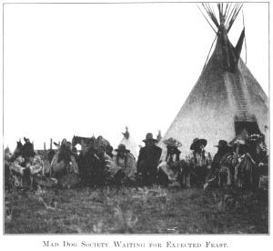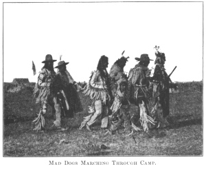 no response, the society seat themselves in a circle and wait, attracting the attention of the entire camp, by drumming and by singing their songs. The mounted leaders move slowly along the line, riding in opposite directions, and making the others rise when it is time to begin the dance. The Mad Dogs formerly had great power, because they were composed of chiefs who had earned a reputation for bravery and everyone feared to act in opposition to them."