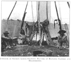 "We placed stones in a circle, near the centre or a new camp ground, where we intended pitching our big dancing tipi. We always entered it early in the morning of the day of our dance. We carried long sticks as spears, with the bark peeled off and wrapped with red and black cloth. Feathers, with small bells attached, were fastened at intervals along the staff and a spear point tied to the end. The leader was called Wolf-Skin-Man. He wore a coyote skin, with the head in front, and tail hanging behind. To the left of the chief sat two men, with white spears driven into the ground before them. Their bodies were painted white and they had yellow stripes across the nose and eyes. This was their distinguishing mark, because the others had red and black stripes over the nose and eyes. Another man, holding a long willow stick, wore a blanket made from an old lodge top, well browned with smoke. To his blanket were tied many buffalo hoofs, so that they would rattle when he moved. Two other men, called "Water Braves," painted black over their bodies, carried on their backs pieces of old lodges made into small bags, which were filled with back-fat and pemmican. They also carried water-bottles.